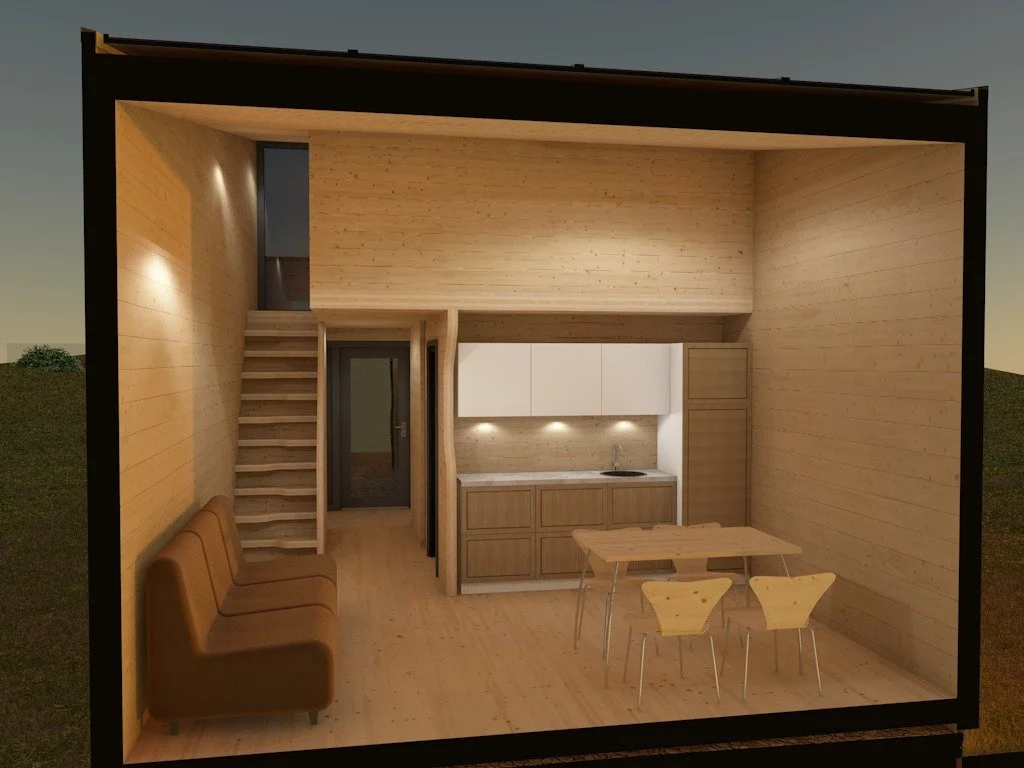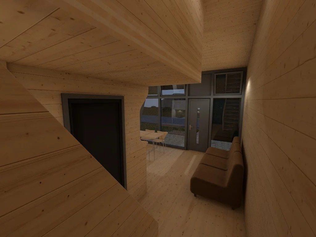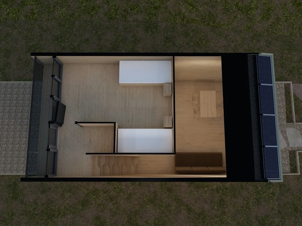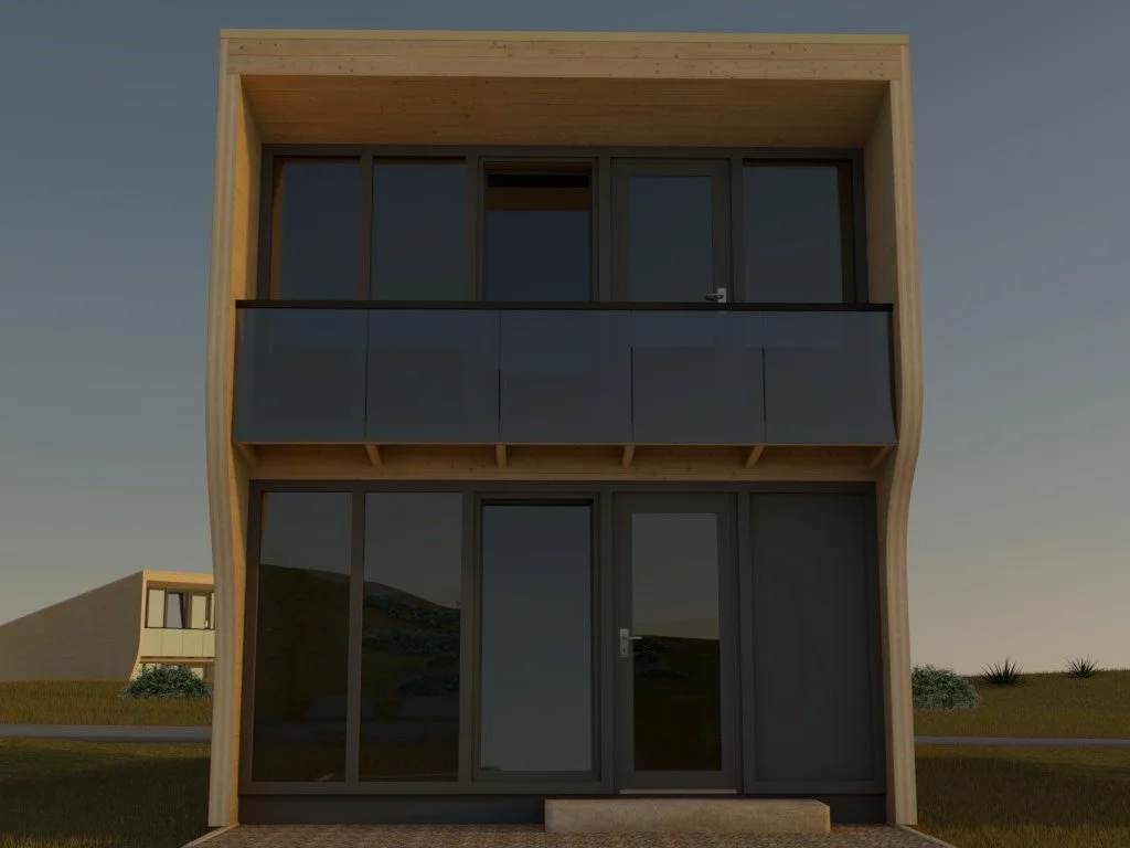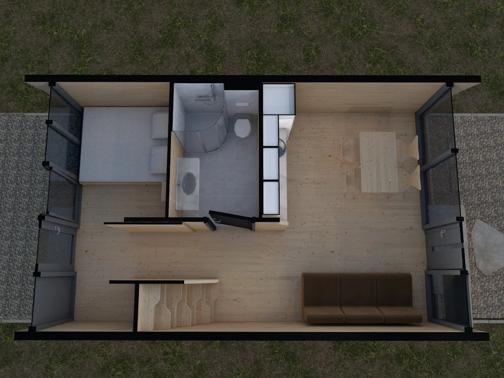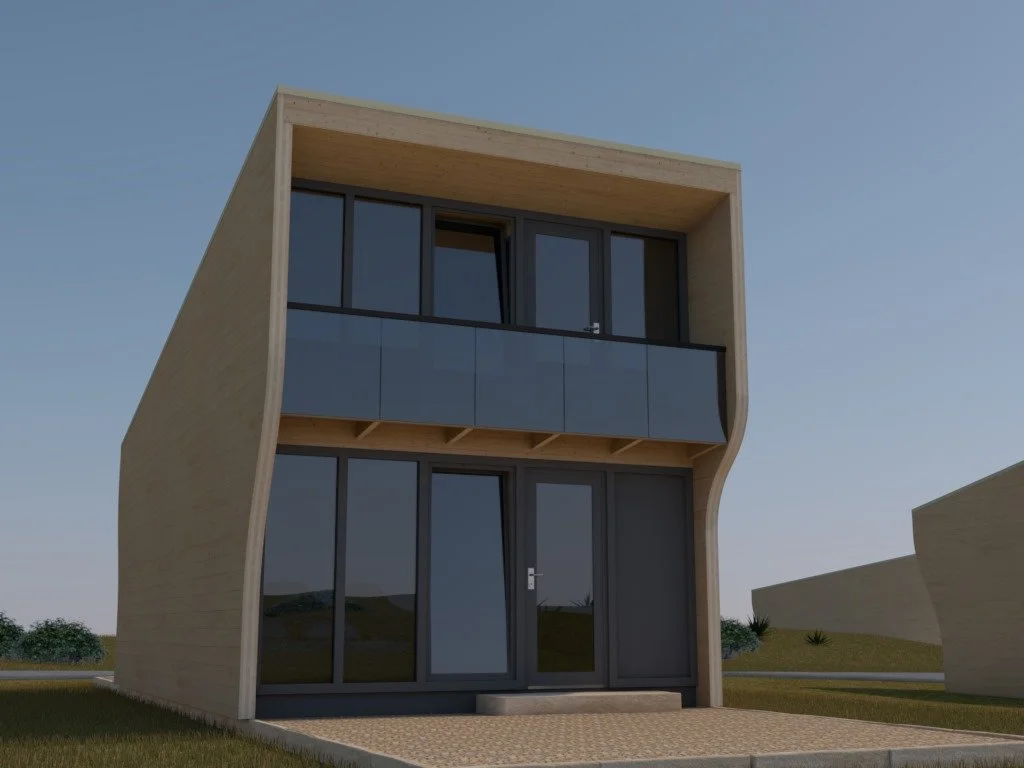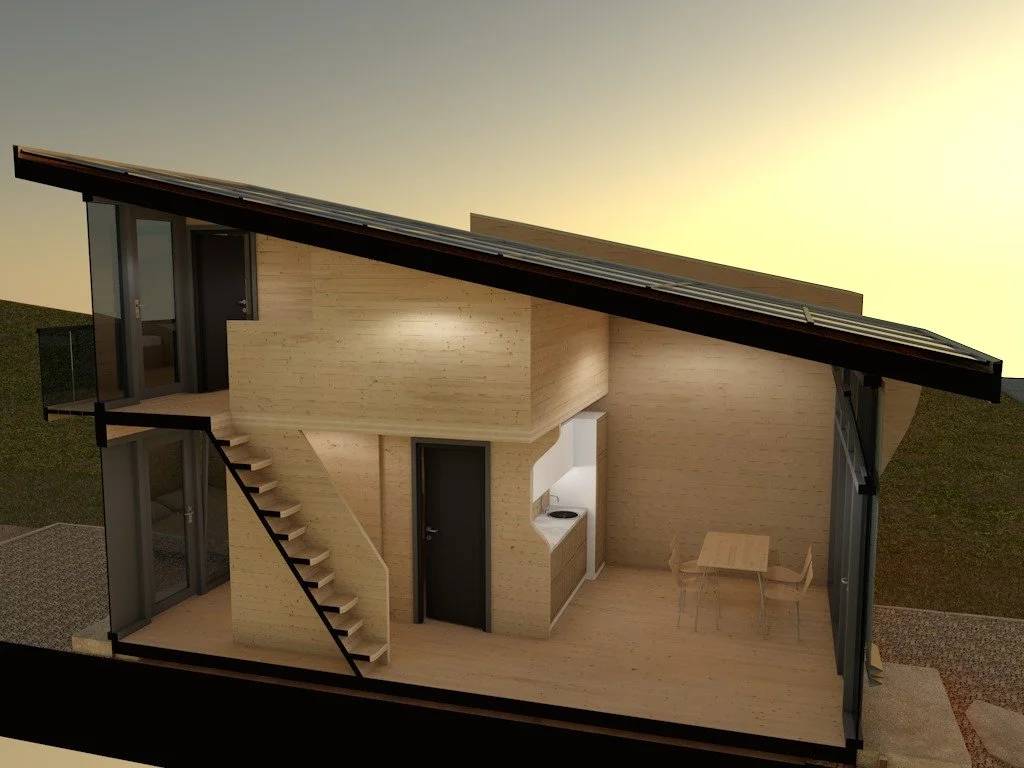 Denne lille hytten eller eneboligen er bygget av massivtreelementer (CLT- eller MHM-elementer). Husets design er inspirert av naturen og passer perfekt inn i alle naturlige omgivelser. I huset benytter vi kun naturlige materialer (som Steico trefiberisolasjon, Proclima diffusjonsåpne produkter, Fermacell m.m.). Husdesignet kan tilpasses av kunden (størrelsen kan endres, rommenes plassering samt plassering av vinduer og dører). Dette huset kan også bygges som en bolig for helårsbruk. Det er også mulig å oppføre dette huset som en frittstående enebolig. Det finnes et bredt utvalg av innvendige og utvendige materialer som kan benyttes for denne husmodellen.