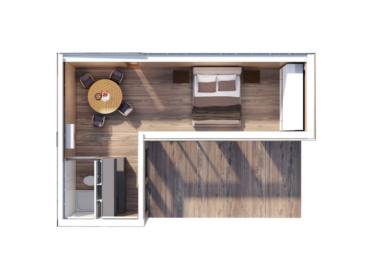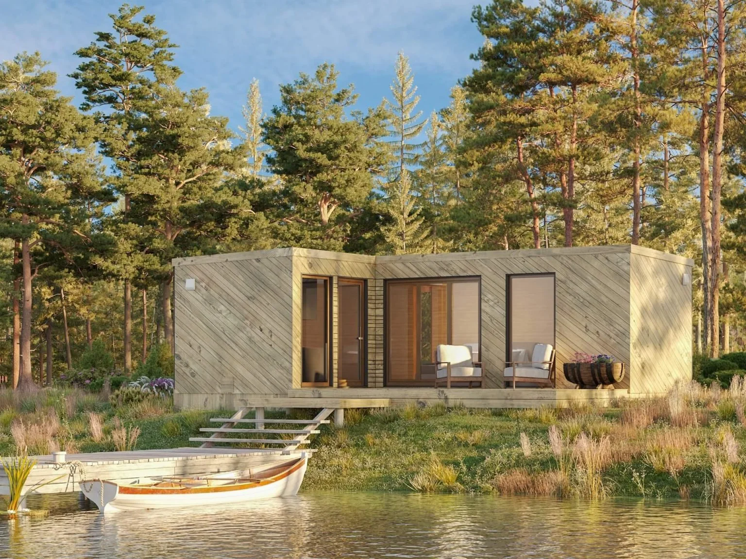 Denne modellen er både praktisk og elegant. De store vinduene slipper inn rikelig med dagslys og gir flotte utsikter. Med solid isolasjon kan minihuset brukes hele året – også i Nord-Norge.