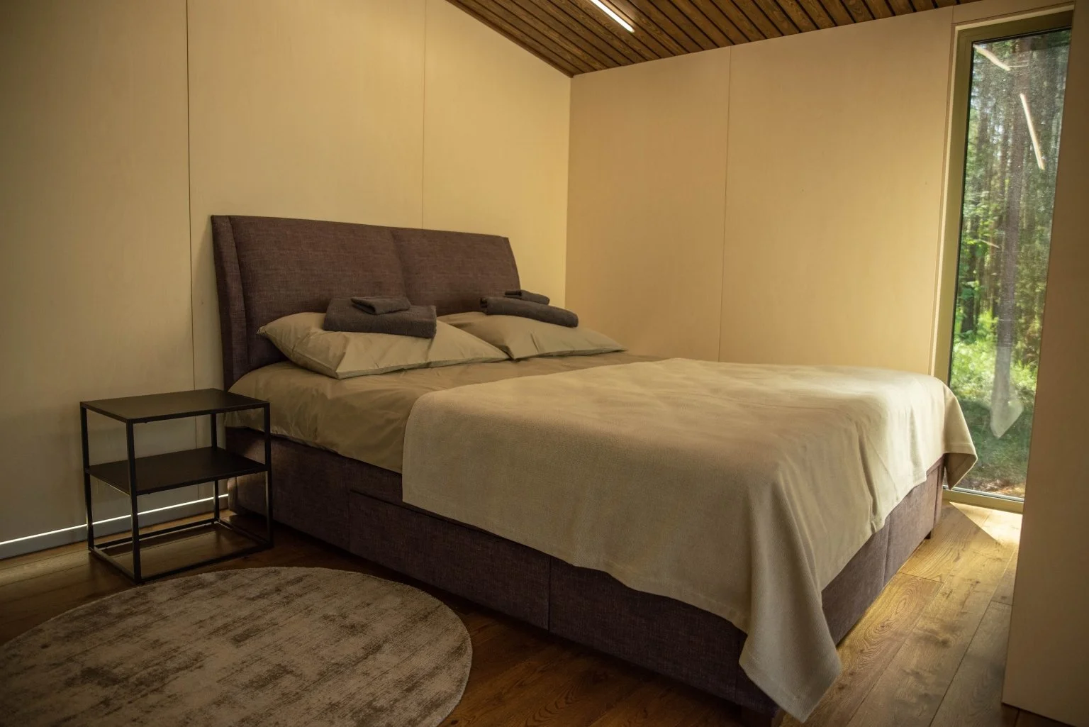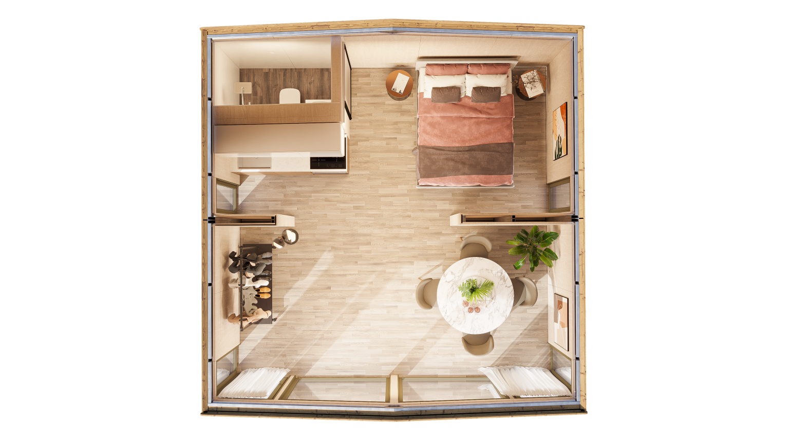 Denne modellen er både praktisk og elegant. De store vinduene slipper inn rikelig med dagslys og gir flotte utsikter. Med solid isolasjon kan minihuset brukes hele året – også i Nord-Norge.